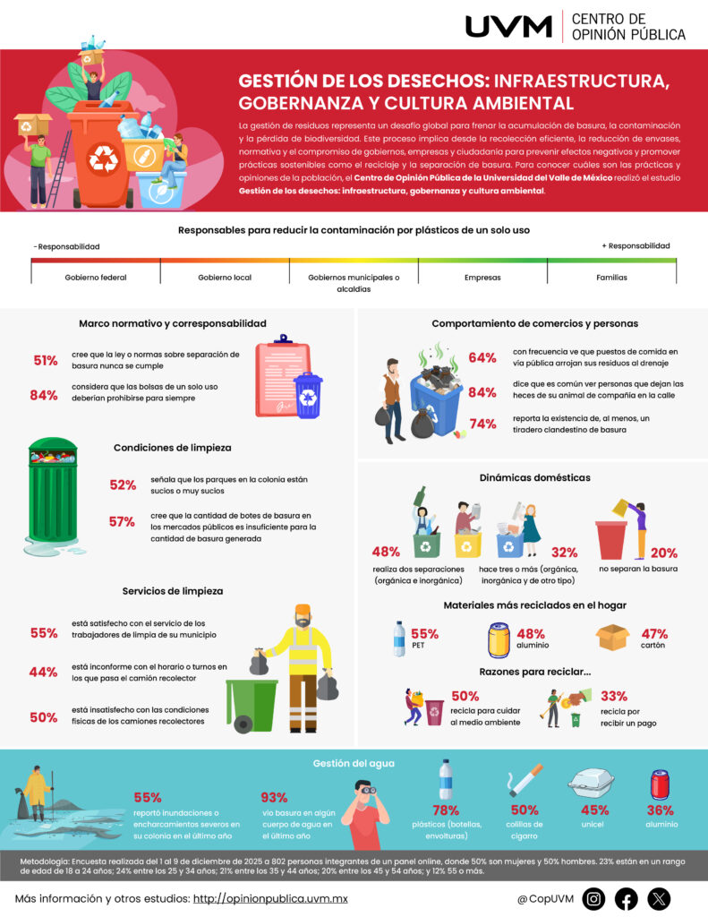 La gestión de los residuos representa uno de los desafíos de mayor urgencia para desarrollo sostenible a nivel global; con una generación diaria que supera las 103 mil toneladas, enfrenta una importante presión sistémica sobre su infraestructura y sus ecosistemas. Para entender esta dinámica, el estudio Gestión de los desechos: infraestructura, gobernanza y cultura ambiental, el Centro de Opinión Pública de la Universidad del Valle de México explora las percepciones sobre la limpieza urbana, el cumplimiento de la ley y los hábitos de reciclaje en los hogares mexicanos.